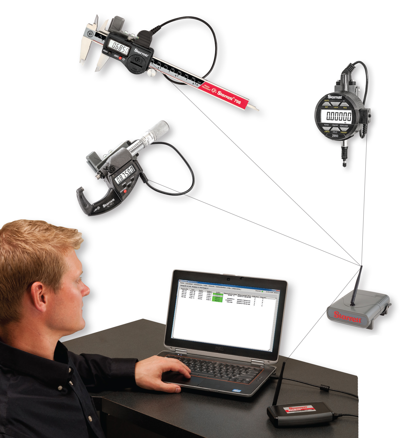 Starrett DataSure® Wireless DCS connects and manages your tools, network, data and third party SPC applications. | Eliminating the Wires - Today's Data Collection Systems In the early 2000's, DCS took a significant leap forward with wireless data collection solutions, greatly improving the ease of collecting and storing data by enabling the monitoring of a wireless network, tools, system status, and tool measurement all from one screen. At the onset, radio backpacks were used to collect data from precision measurement tools, but were considered difficult to assemble and were not waterproof such as some of the tools they were connected to. This prompted new end node designs that were easier to assemble, more cost-effective to manufacture and waterproof to an IP67 rating. Additional enhancements have included improved performance and battery life as well as the addition of DDE (Dynamic Data Exchange), Remote Client over TCP/IP (Transmission Control Protocol/Internet Protocol), support for multiple languages, and drag and drop virtual multiplexer support for easy configuration of tools and work cells. Today's wireless DCS solutions provide real-time, 100% error-free data collection. From simple installations to systems covering thousands of square feet, data is collected and analyzed much faster. Transmission users receive confirmation at the tool. With the elimination of cumbersome and expensive data cables, precision measuring tools can be brought to the work, rather than bringing the work to the tool. |