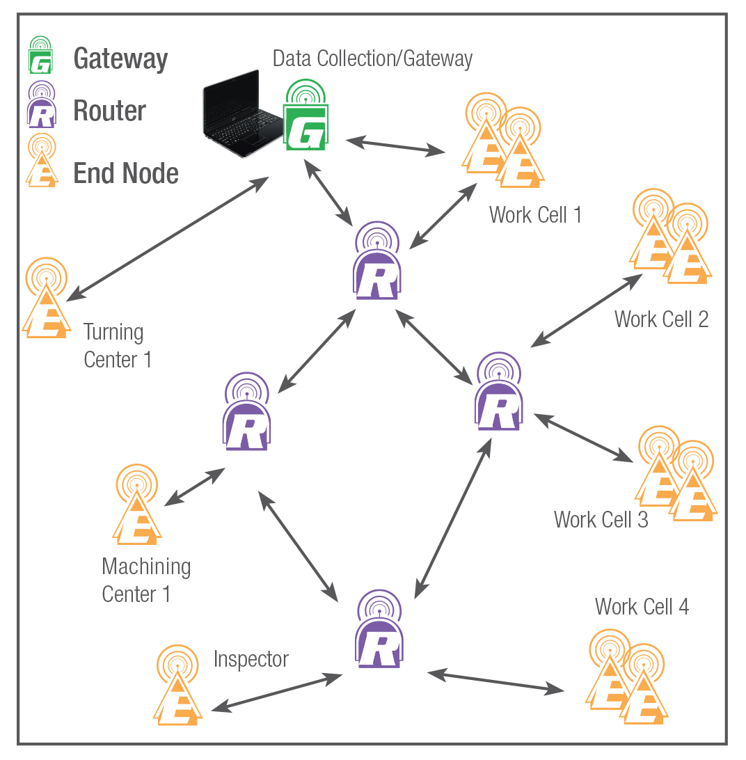 | End node radios can now store readings at the tool end in the event that the main system is down or busy, and a base system handles hundreds of tools, with 25 to 40 tools in a typical installation. Each radio's range is approximately 65' and adding routers can increase the range in 100' increments. A multi-mode software feature allows one tool to be connected to a gateway for simple installations, or up to 20 multiplexers and 100 tools for complex shop environments. Users today can expect to work seamlessly with all major SPC software programs, and now data collection systems support nearly all handheld metrology tools with a serial output connection. Solutions are built for rugged durability with end nodes, routers and gateways that perform reliably in almost any environment, such as in the harsh and demanding ambient conditions often found on the shop floor. The illustration to the left demonstrates how a large, multi-workstation shop might be networked with Starrett DataSure® Wireless DCS. Tools at various locations collect data. The End Nodes send data to the nearest Router, and then to the Gateway, or directly to the Gateway if that is the best path. The Gateway sends a signal back through the same path to the End Node to confirm receipt of the data. |