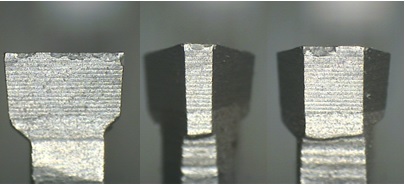 Below are examples of damage to a tooth’s cutting edge that can happen when the proper break-in process is not followed. The photos show Carbide Tipped band saw blades. The blade was run at full speed and with full feed pressure on its initial cut. It is easy to see how the sharp edges of the teeth have been unevenly chipped off.