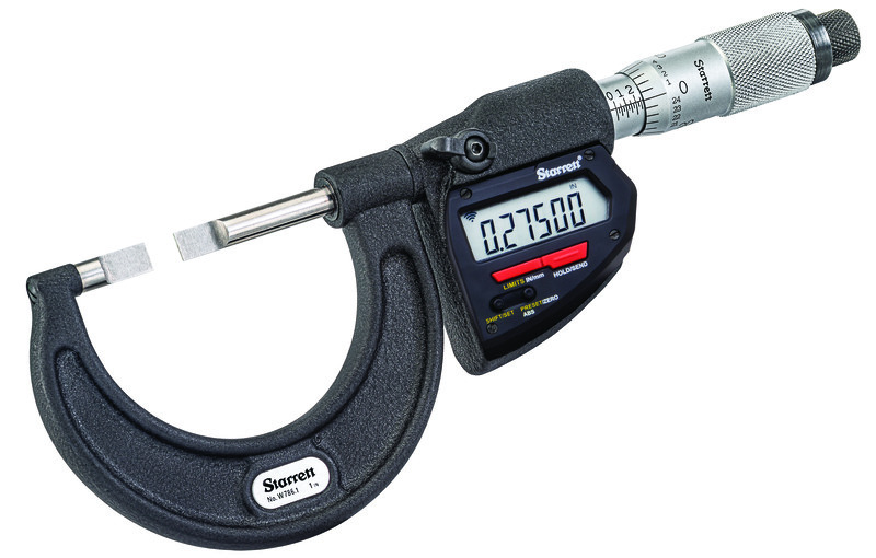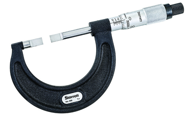 The Starrett Blade Micrometer has thin precision ground blades on the anvil and non-rotating spindle tips allowing accurate measurement of features such as narrow ring grooves, slots and keyways. Custom blades, custom blade orientation, carbide, ratchet and larger measuring ranges are available thru our Special Order department.